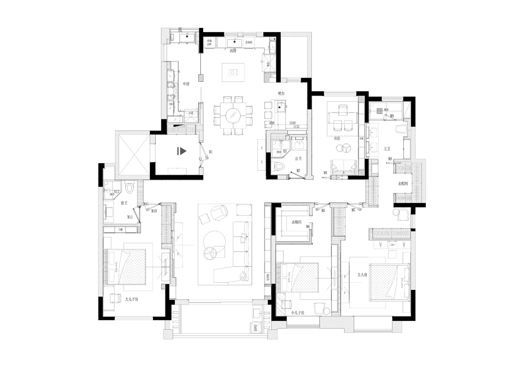 餐厨:客厅=1:1——客厅空间规划的日常容纳人数应是餐厨空间的人数接纳基准,保证到访客人在客厅都能有位置坐着交流,也能确保同数量客人移步餐厅后都有位就餐;