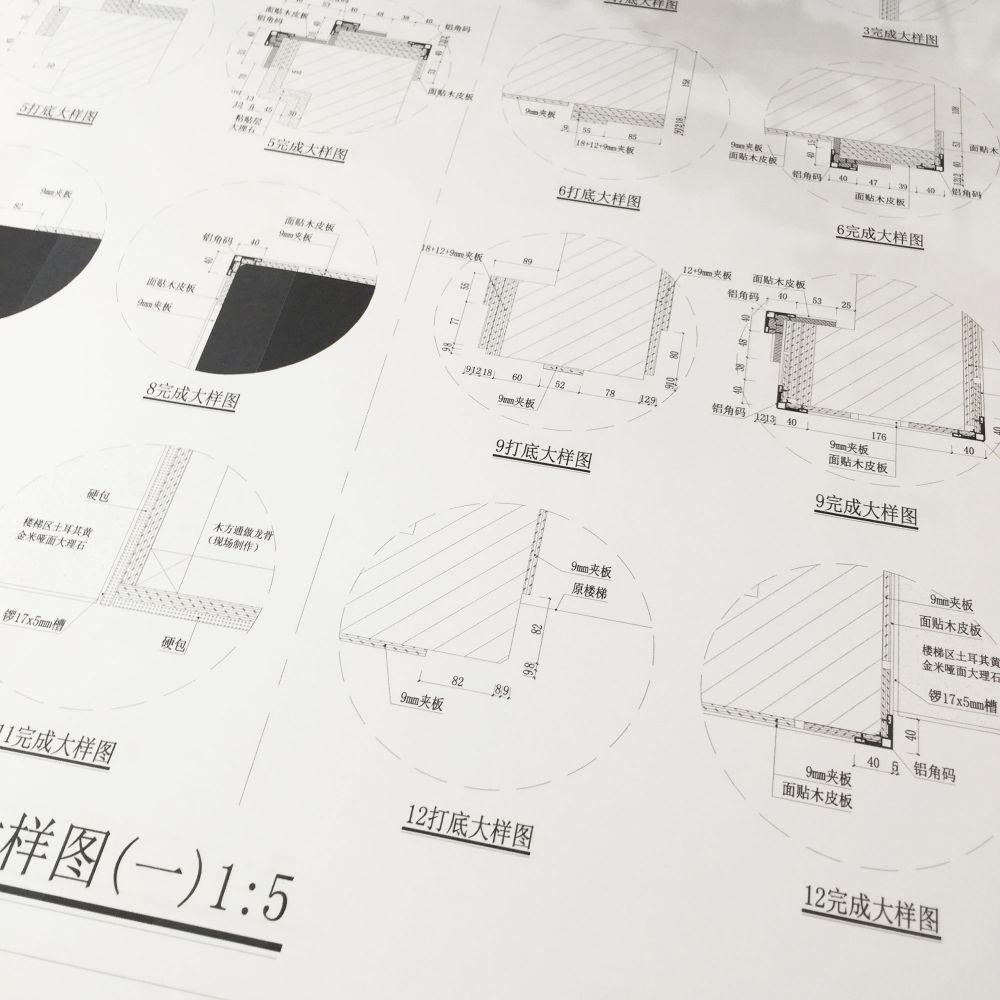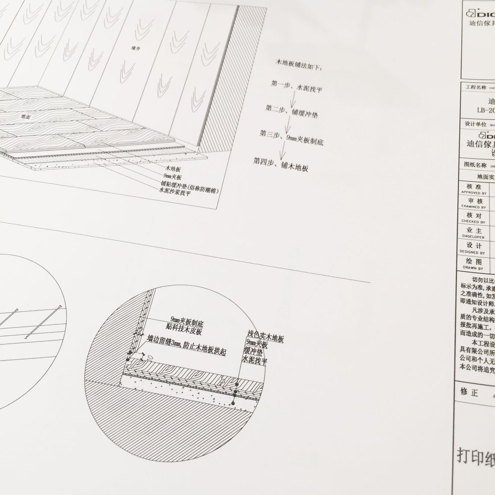 迪信的图纸是整个生产流程的精华,毫不夸张的说,一张图纸贯穿与指导着整个装修流程,小到前期零部件的生产、大到整个装修的流程以及对于施工人员的操作注意事项等等,图纸不仅仅是一张简单的设计稿与施工稿,更是设计师与工艺师思想的精粹。