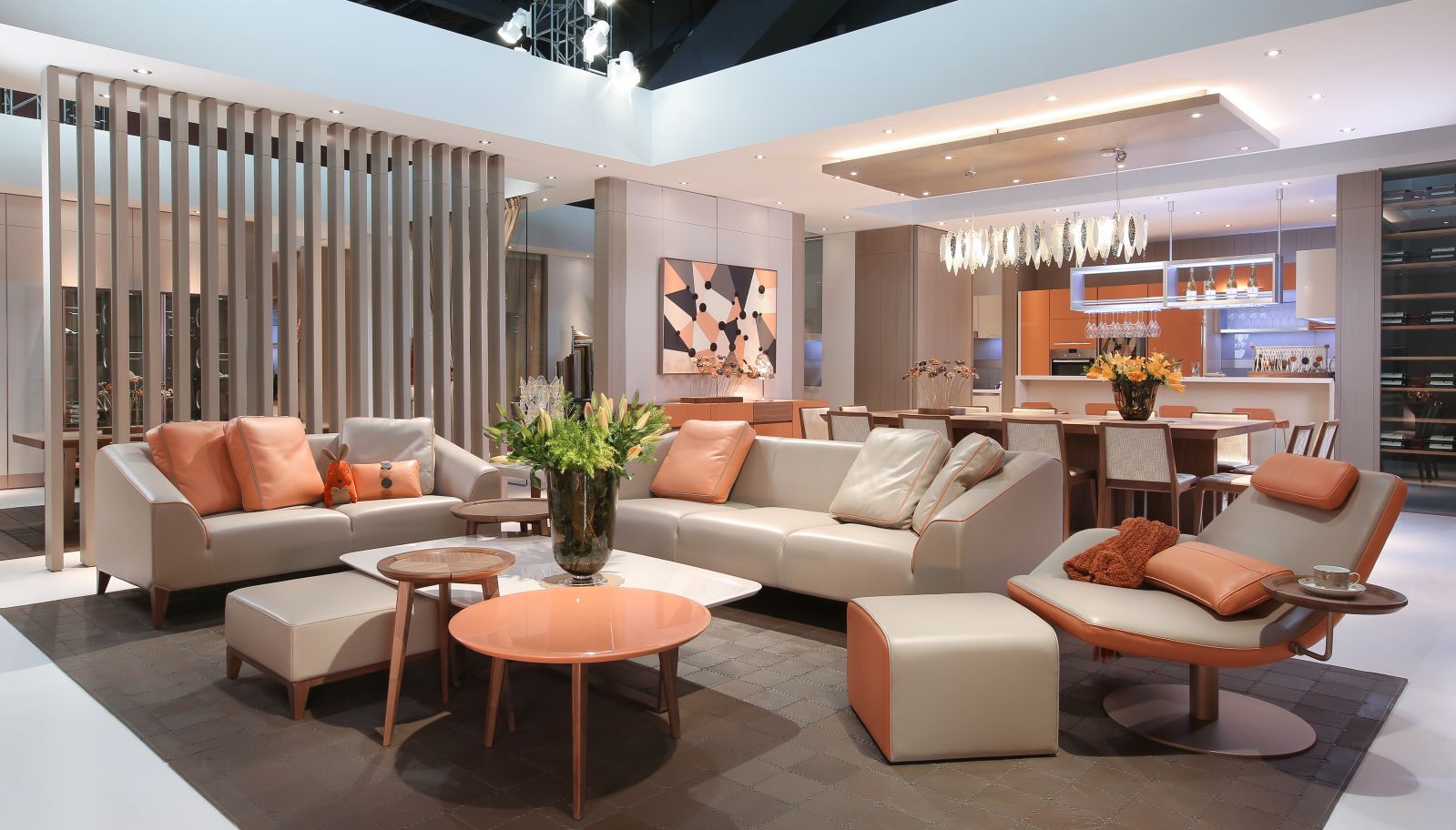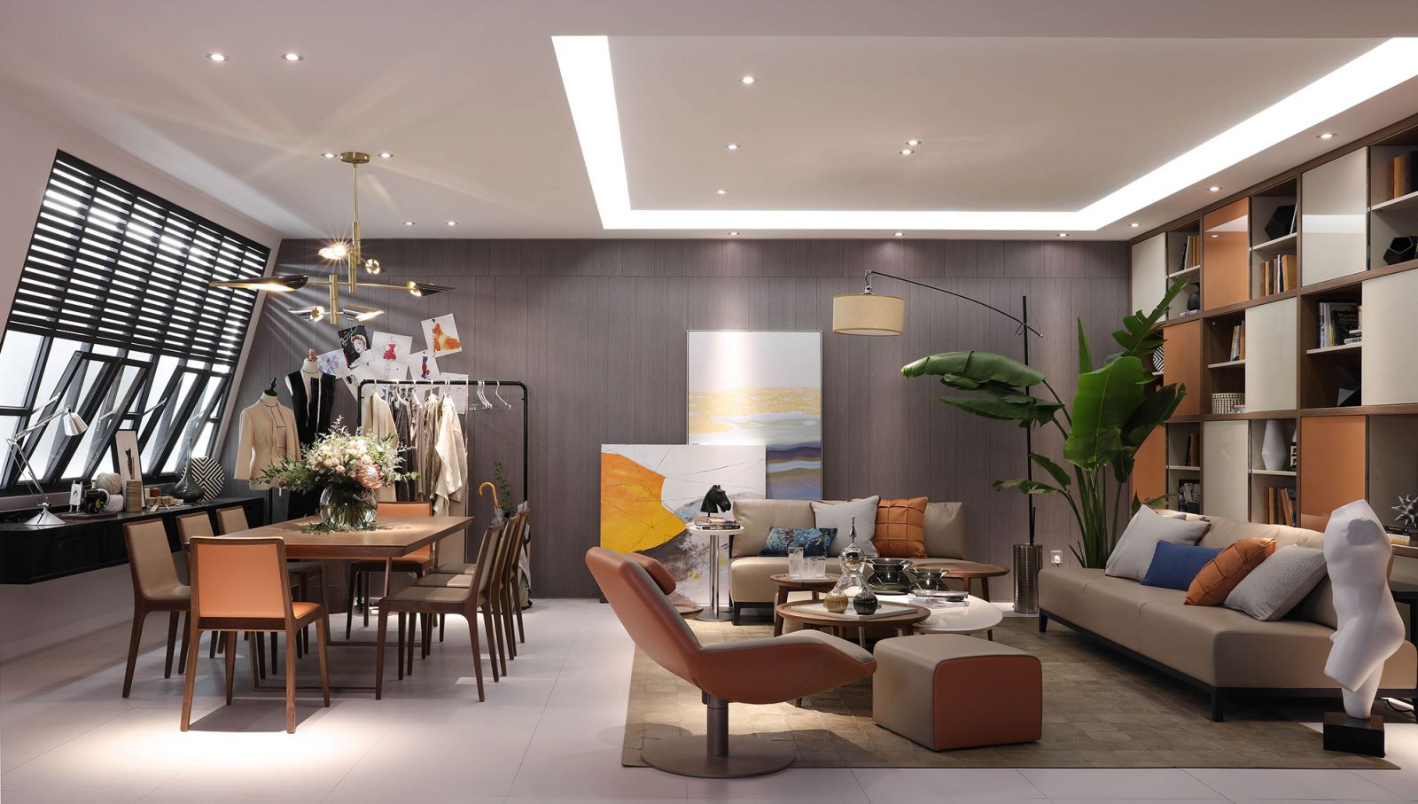 而迪信的特殊性就在于,他是二者合一。不仅有固定家具的定制挂板,橱衣柜,餐厨空间等部分,还有移动家居的餐桌椅、茶几等部分,再包括软体的沙发、床、软饰……乃至灯具和卫浴空间。