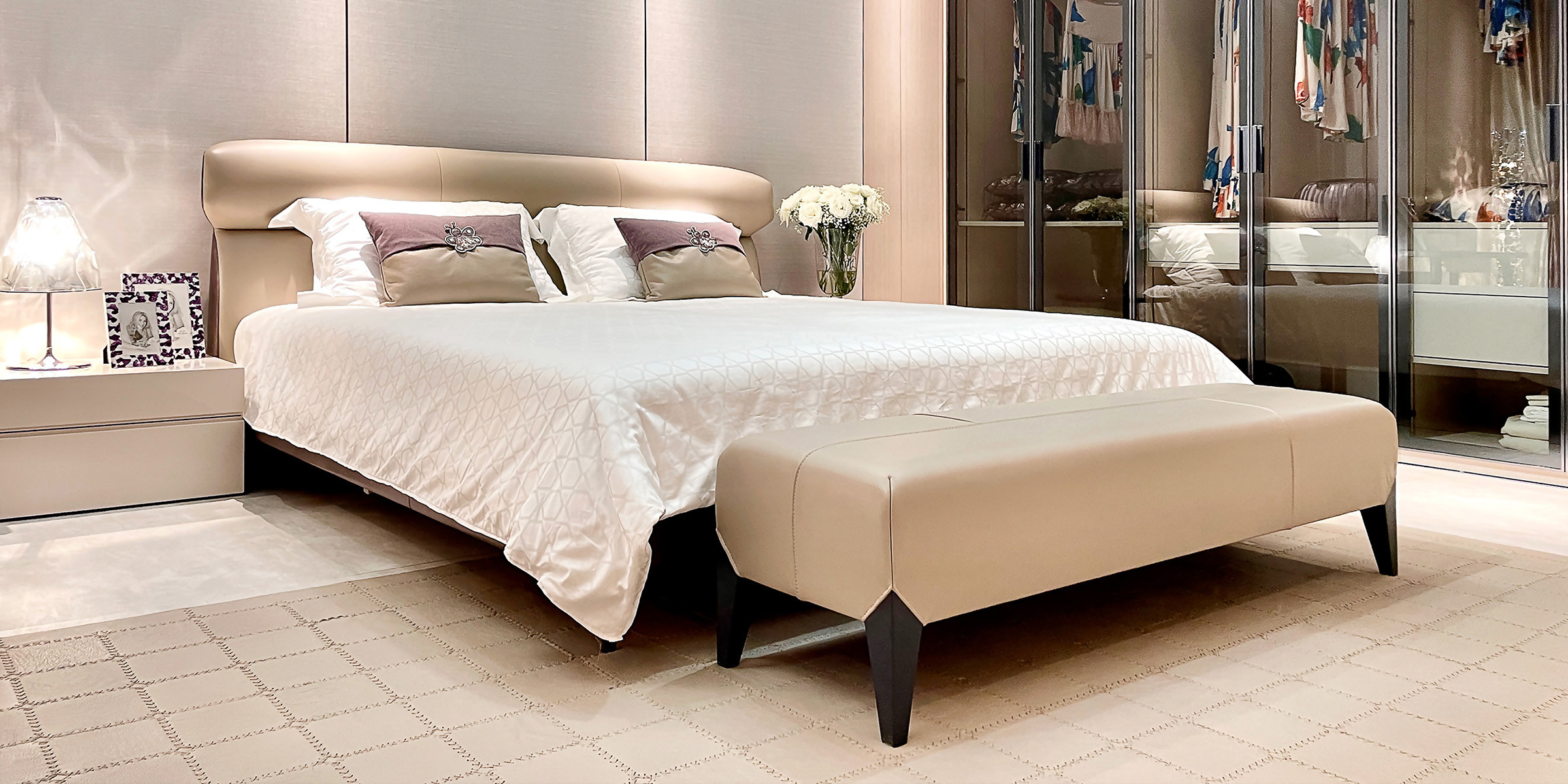 床屏枕头设计,贴合人体背部与颈部曲线;头枕褶皱效果设计,突显质感;真皮床围圆滑设计,贴心细腻。