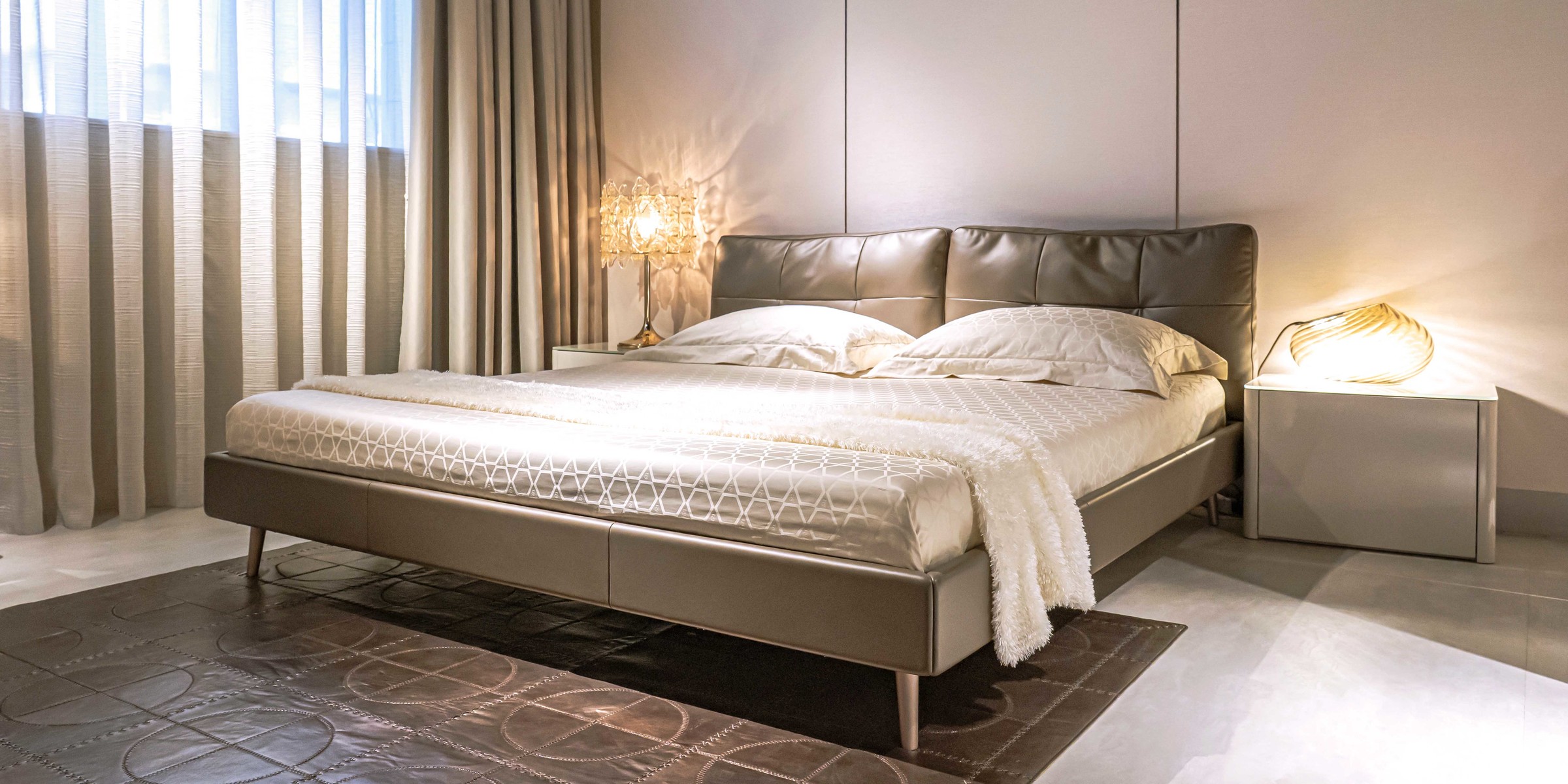 皮带扣式设计的床屏,结合玫瑰金色金属框架,显得时尚且赋有活力;超薄的床围采用真皮包裹,让整张床简洁而有温度。