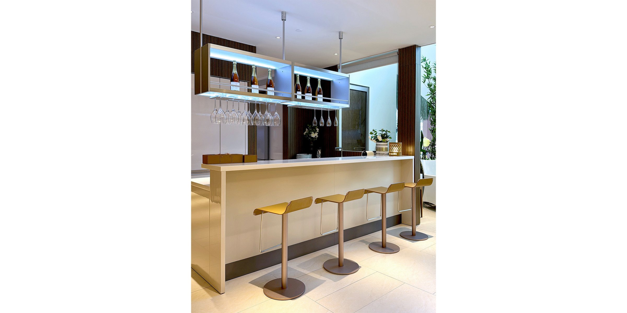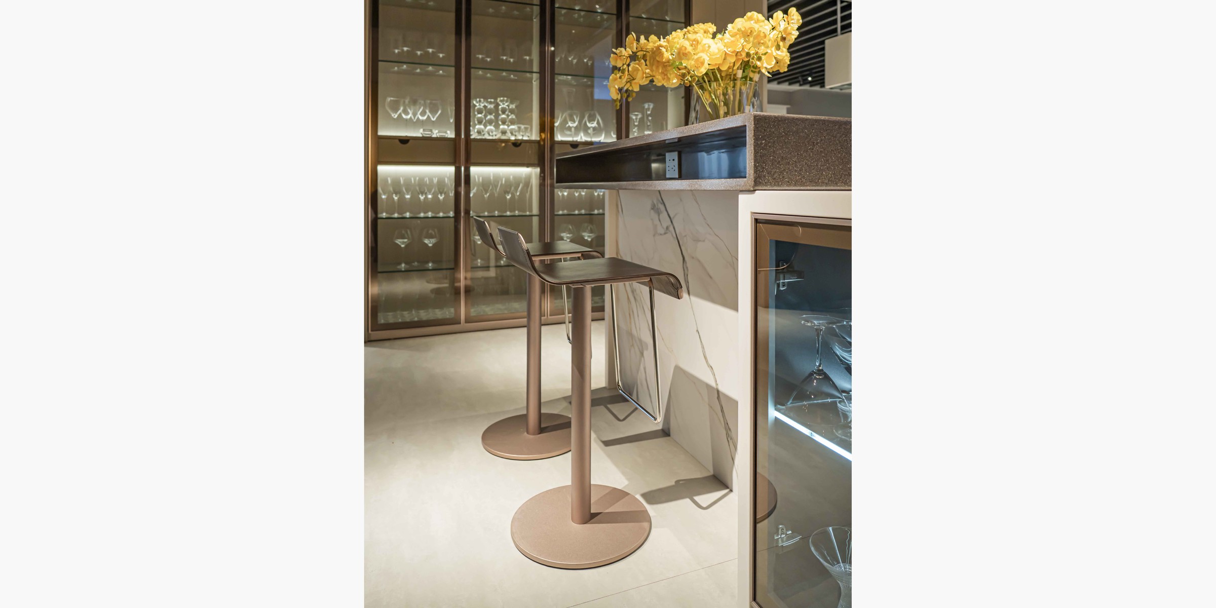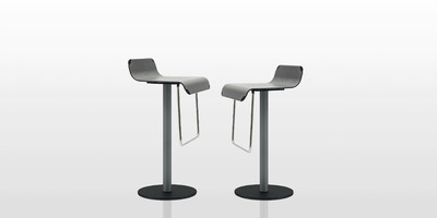 吧椅采用立柱转盘和抛光脚架设计,座垫处为优质树膏皮,纤巧时尚。