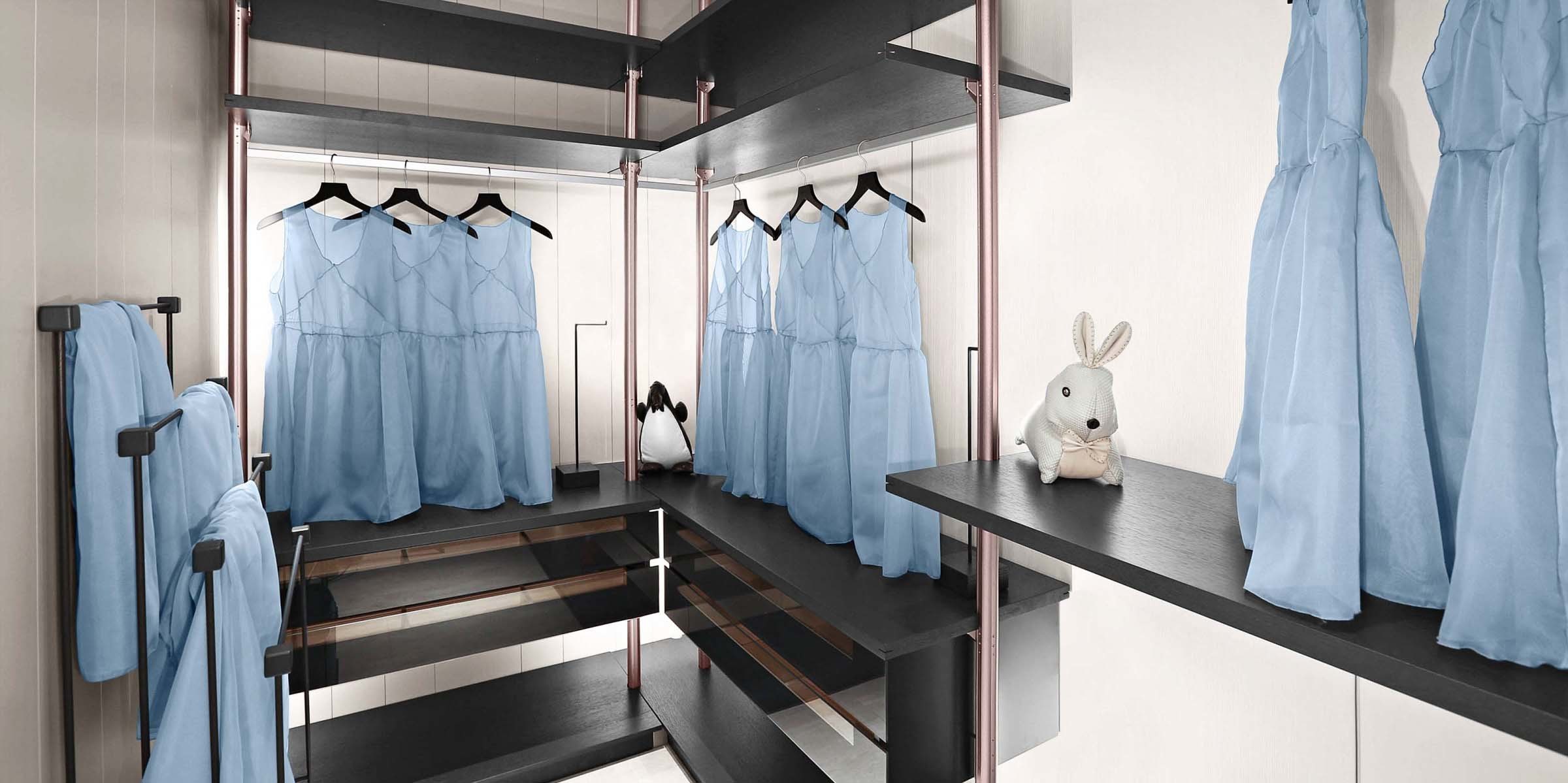 全开放式的衣帽间,采用金属支架连接,时尚简约;拥有清新的色彩搭配,抽屉可收纳小件物品,精致而实用。