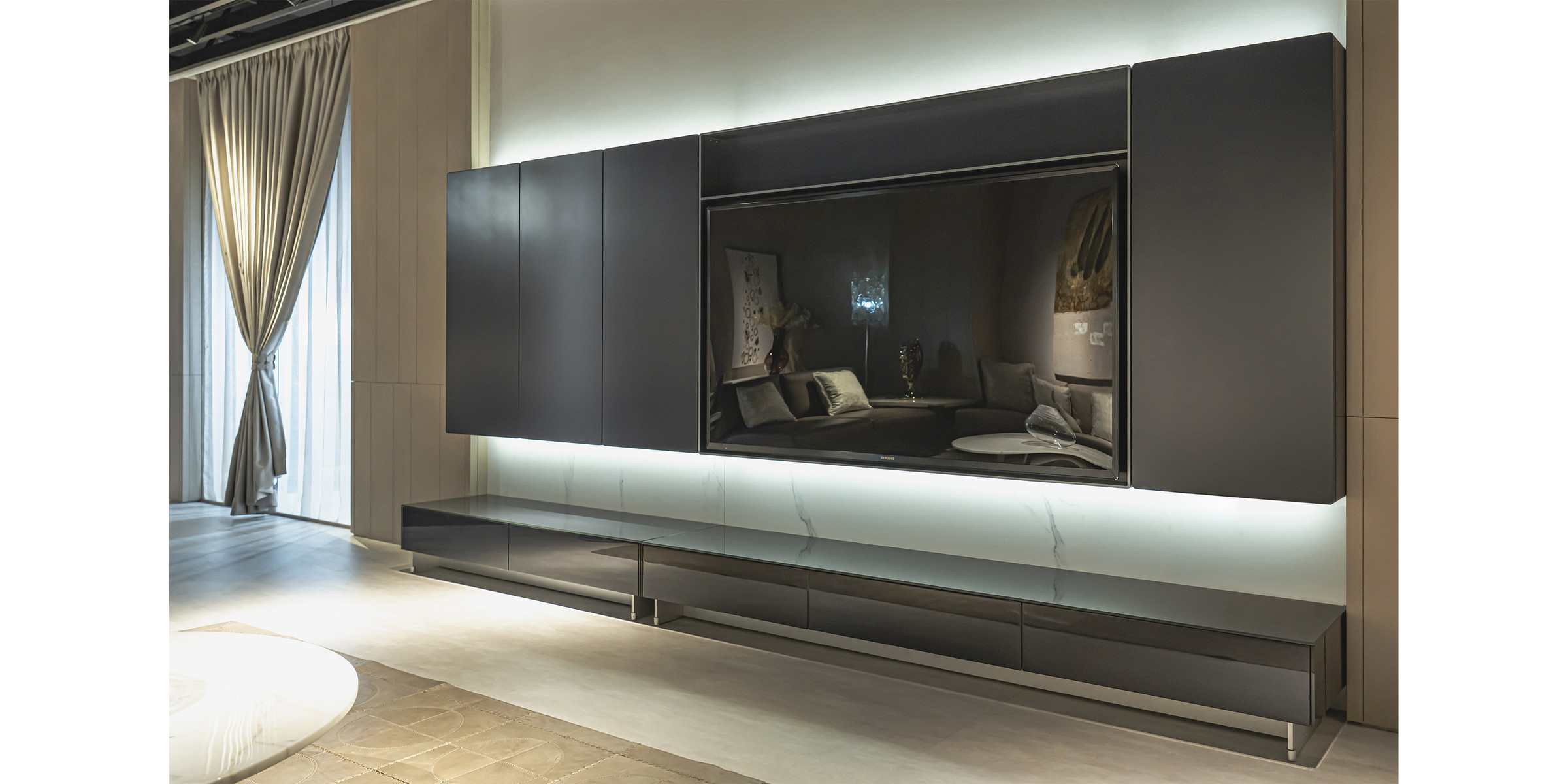 挂柜、电视框和玻璃地柜组合多样;尺寸多选,哑光与玻面呼应,满足储物的同时也给电视背景增添了设计感;地柜可选择DF-D814地柜或DFK2851多用柜。