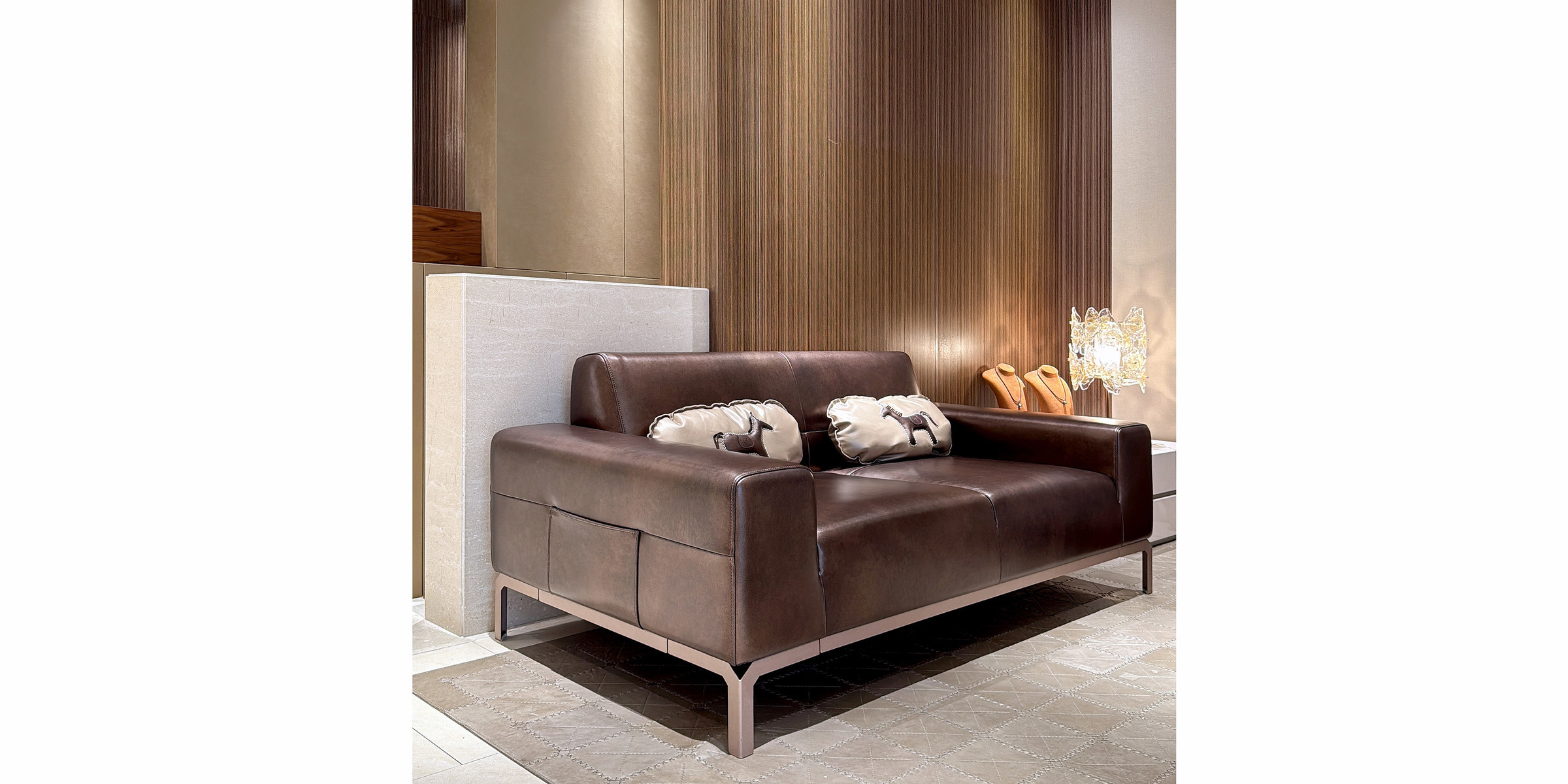 沙发整体线条和结构立体剪裁,一体式的靠背外观造型,配以玫瑰金色金属脚,代表着简练、硬朗。