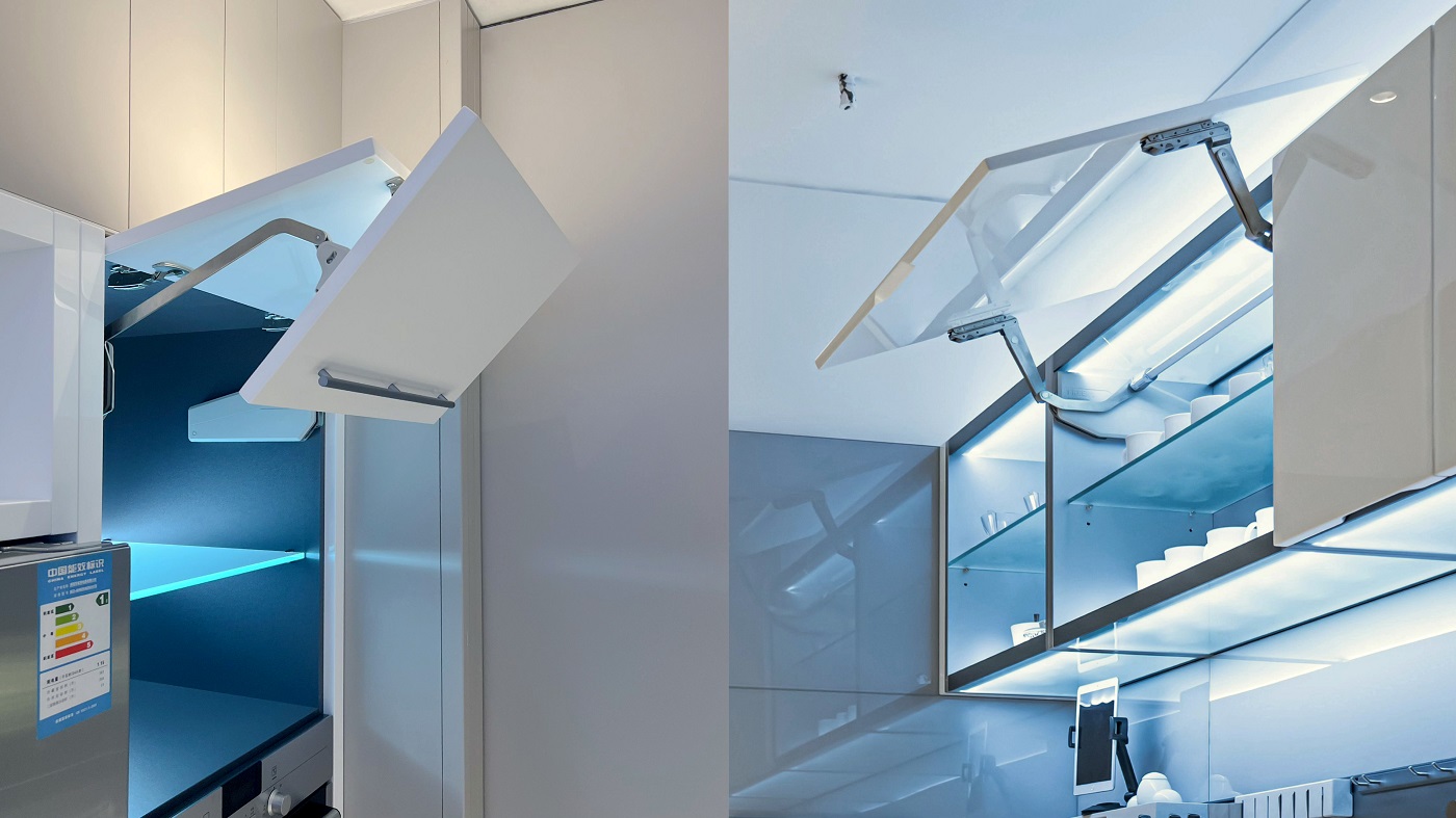 凯斯宝玛FREE Swing上揭折撑/FREE Fold上揭摺撑 轻⼒揭折开启柜⻔,操作省⼒,静⾳设计;开启时⻔板可于任何 位置⾃由悬放,闭合时与柜⾝完美贴合。这种设计的灵活性成为 提升厨房美观度和功能性的理想选择。