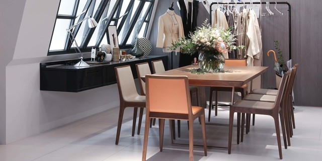 迪信最具代表性的餐椅;采用传统榫卯工艺,结合意大利真皮或布料,整体线条流畅、结构稳固、坐感舒适。
