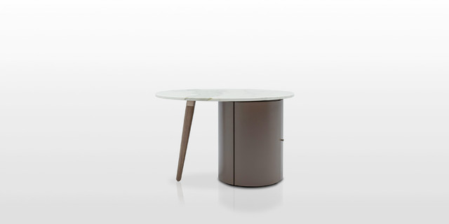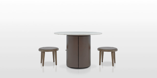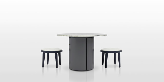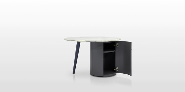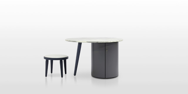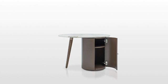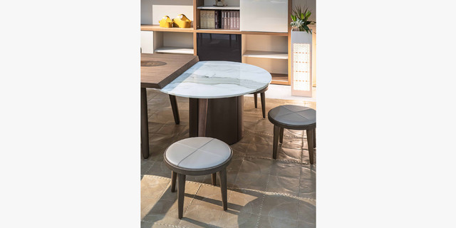 大理石面板质感圆润,圆形的多功能储物柜不分方向,可与茶台搭配作为副台使用。