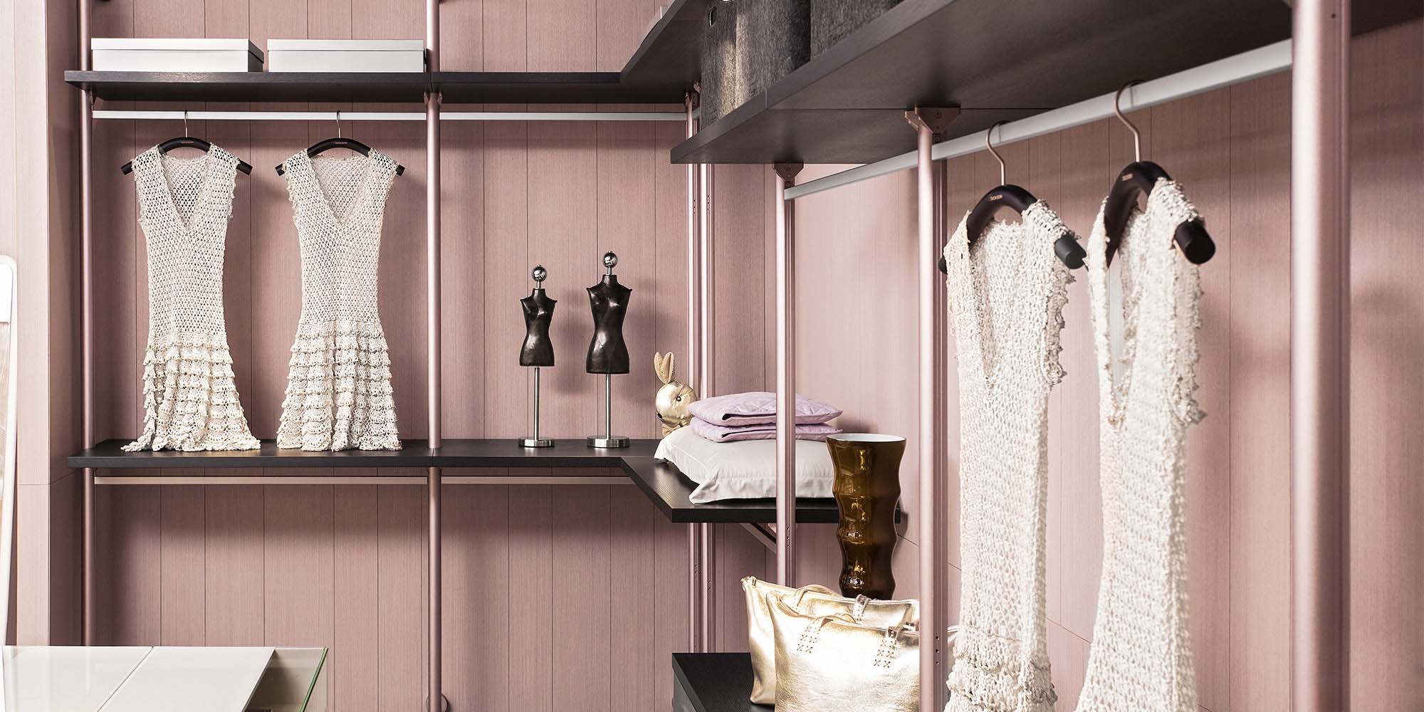 全开放式的衣帽间,采用金属支架连接,时尚简约;拥有清新的色彩搭配,抽屉可收纳小件物品,精致而实用。