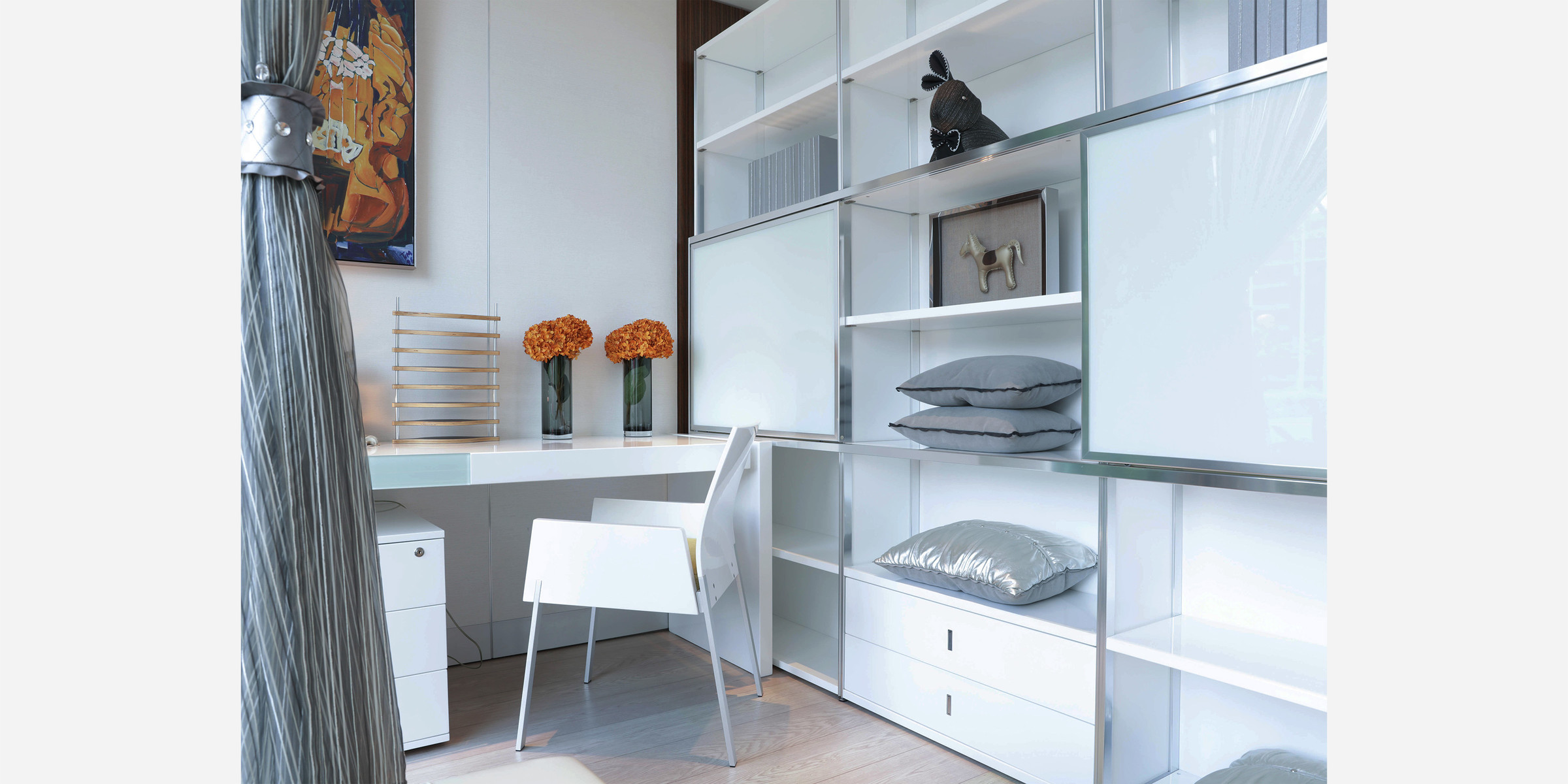 简约的设计,线条感十足,面板与侧板由铝合金件相连接,配合玻璃面板抽屉,使整张桌子显得时尚简约。