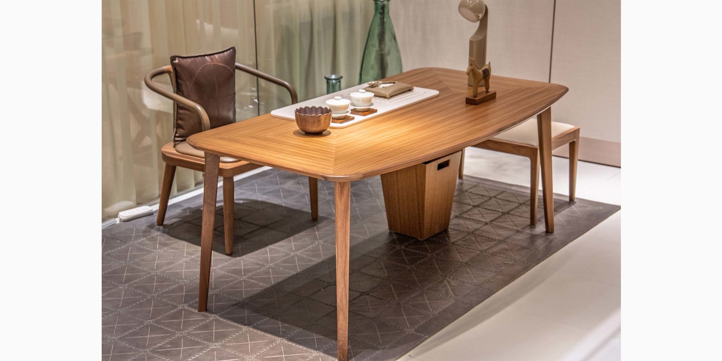 精选北美橡木或胡桃木贴面,实木脚架,人造石茶盘,台面弧形抹边设计,美观实用。